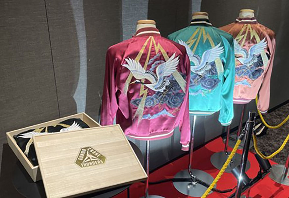 当社がオーナーを務めるプロバスケットボールチーム「群馬クレインサンダーズ」の社会的責任活動「CRANE THUNDERS ONGAESHI」(クレインサンダーズ恩返し)の取り組みとして、2023年、群馬県出身で「現代の名工」に選ばれた刺繍作家、大澤紀代美さんが桐生市伝統の「横振り刺繍」を縫い込んだ、チーム特別仕様のスカジャンを製作、販売しました。同年、チームのホームアリーナ「OPEN HOUSE ARENA OTA(オープンハウスアリーナ太田)」が誕生したことを記念した取り組みです。アリーナが誕生した群馬・東毛地域で、古くから織物の町として栄えた桐生市に根付いた繊維関連の伝統産業の価値を再認識し、広く知ってもらおうと、当社グループが企画しました。売上から製作費などのコストを除いた全額が、CRANE THUNDERS ONGAESHIを通した社会的責任活動に充てられました。